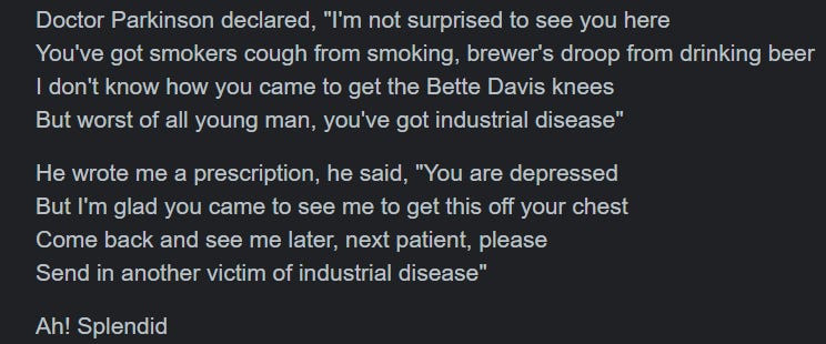 I can imagine that Mark drew the envy of countless songwriters in the previous 45 years - - many songs from the Dire Straits body of work have immaculate execution, a rock-solid lyrical component, and, as I’ve discovered recently while delving into footage of audio festivals, are routinely used to test extremely high-end sound reproduction equipment for thousands of attendees. So while he might stray from a full-scale public inquiry, perhaps he can shed light on the “Industrial Disease” of our time?
