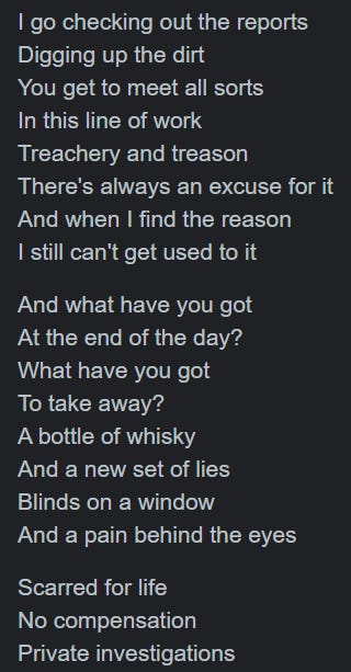 What Dire Straits described in 1982 can readily apply to our own age - - the age of the individual who has to “shield” his investigation from the outside world, avoiding full transparency for fear of a backlash. “It’s not a public inquiry,” we’re told earlier in the song “Private Investigations.”
